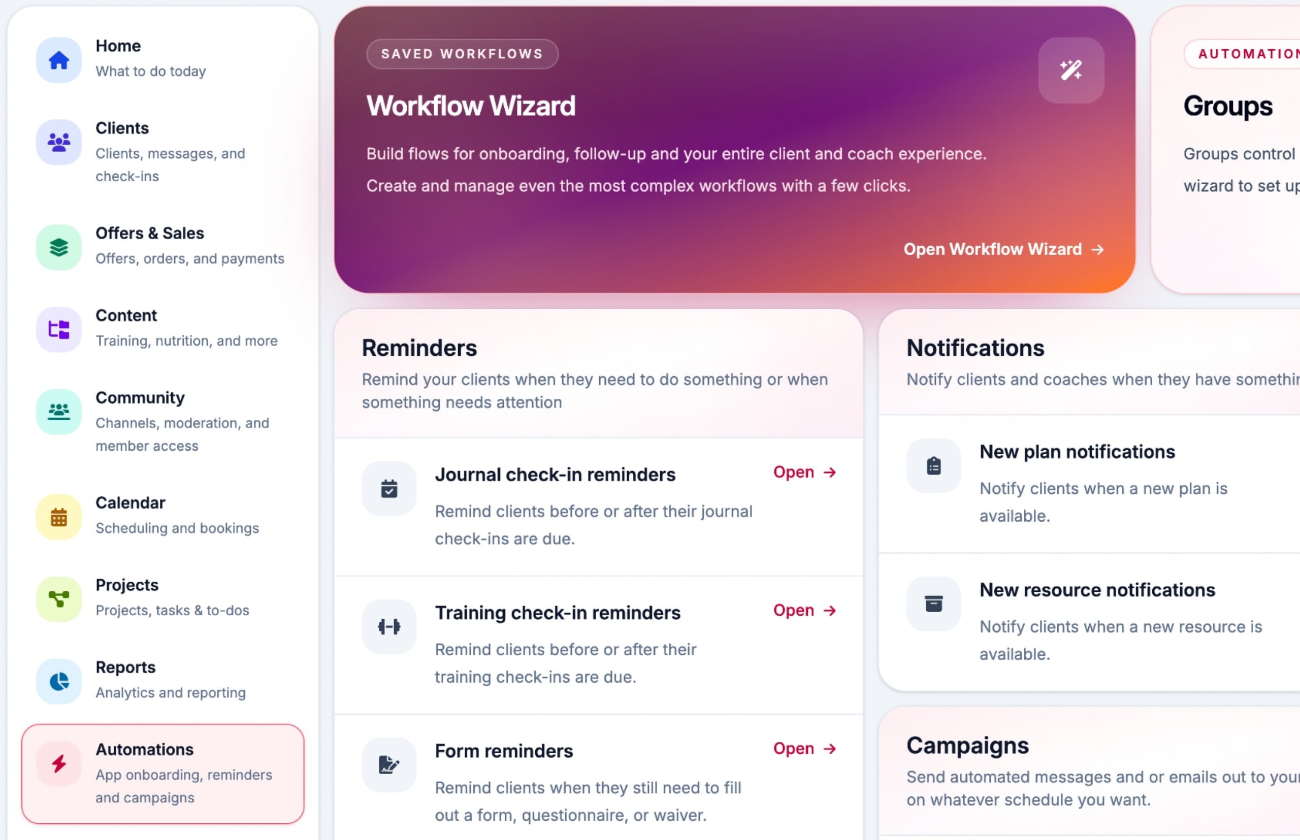 Give your clients the exact experience that you want. Groups ensure that different types of clients, as they move through their programs, get the correct experience at every point along the way.